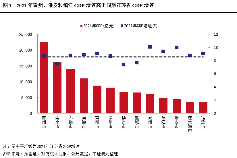 2021年蘇州、南京和無(wú)錫GDP規(guī)模繼續(xù)處于領(lǐng)跑地位,但泰州、淮安和鎮(zhèn)江GDP增速高于同期江蘇省GDP增速。2021年江蘇省13個(gè)地級(jí)市GDP規(guī)模均有所提升,但排位順序未發(fā)生變化。從GDP規(guī)模看,2021年GDP規(guī)模突破萬(wàn)億的地級(jí)市依舊是蘇州、南京、無(wú)錫和南通,數(shù)量較2020年無(wú)變化。2021年,蘇州、無(wú)錫和南京GDP總和占江蘇省GDP的45.61%,較2020年下降0.49個(gè)百分點(diǎn)。蘇北地區(qū)中宿遷、連云港和淮安GDP規(guī)模依舊偏弱,依舊處于省內(nèi)最后三位。從GDP增速來(lái)看,2021年由于疫情得到有效控制,各地級(jí)市GDP增速均高于2020年。2021年,南京、揚(yáng)州和鹽城GDP增速低于同期江蘇省GDP增速,泰州、淮安和鎮(zhèn)江雖然廣義債務(wù)負(fù)擔(dān)較重,但2021年GDP增速明顯高于同期江蘇省GDP增速,其余地級(jí)市GDP增速基本和江蘇省GDP增速持平。