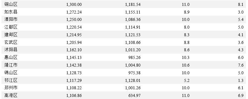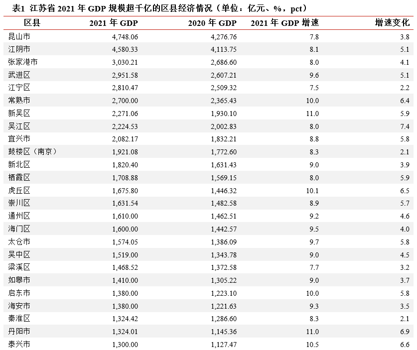 2021年除邗江區(qū)外,江蘇省其他各區(qū)縣GDP規(guī)模均有所提升,響水縣GDP增速下滑0.1個(gè)百分點(diǎn)。2021年江蘇省各區(qū)縣GDP規(guī)模大多處于增長(zhǎng)狀態(tài),其中昆山、江陰和張家港市GDP規(guī)模仍處于頭部位置,且2021年張家港GDP突破三千億大關(guān),新吳區(qū)和宜興市則突破兩千億大關(guān)。但邗江區(qū)2021年GDP下滑10.72億元至1,117.29億元。GDP增速方面,除盱眙縣、沛縣、贛榆區(qū)和豐縣未獲得GDP增速外,2021年江蘇省大部分區(qū)縣GDP增速均高于2020年,但響水縣GDP增速下滑0.1個(gè)百分點(diǎn)至6.0%。