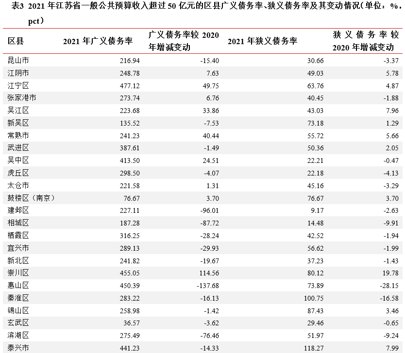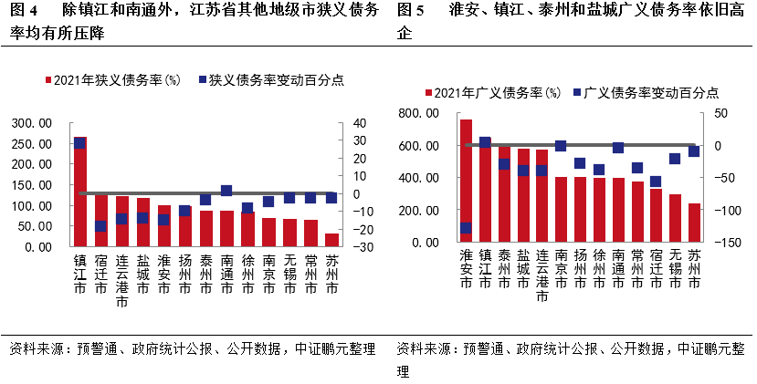 債務(wù)情況:鎮(zhèn)江市化債壓力依舊較大,洪澤區(qū)、高港區(qū)和京口區(qū)狹義債務(wù)率增加明顯,但江蘇省區(qū)縣級(jí)債務(wù)率整體仍有壓降。地級(jí)市層面,2021年除鎮(zhèn)江和南通外,其余地級(jí)市狹義債務(wù)率均有所壓降,2021年鎮(zhèn)江狹義債務(wù)率上升27.91個(gè)百分點(diǎn)至265.59%,淮安、鎮(zhèn)江、泰州和鹽城的廣義債務(wù)率依舊較高。區(qū)縣層面,2021年洪澤區(qū)、高港區(qū)、丹徒區(qū)和泗陽(yáng)縣狹義債務(wù)率超過(guò)200%,債務(wù)負(fù)擔(dān)較重。蘇州市、無(wú)錫市和常州市因財(cái)政實(shí)力較強(qiáng),下轄區(qū)縣狹義債務(wù)率整體偏低,2021年江蘇省95個(gè)區(qū)縣中有55個(gè)區(qū)縣狹義債務(wù)率較2020年有所壓縮,其中淮安區(qū)狹義債務(wù)壓縮最明顯(下降81個(gè)百分點(diǎn)),2021年新沂市和洪澤區(qū)廣義債務(wù)率分別超過(guò)900%和700%,大豐區(qū)、連云區(qū)、高淳區(qū)、海州區(qū)、浦口區(qū)和溧水區(qū)廣義債務(wù)率亦高于600%,但95個(gè)區(qū)縣中有61個(gè)區(qū)縣廣義債務(wù)率較2020年有所壓降。