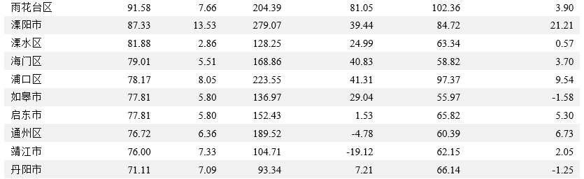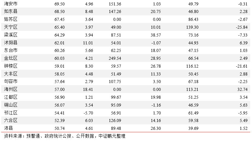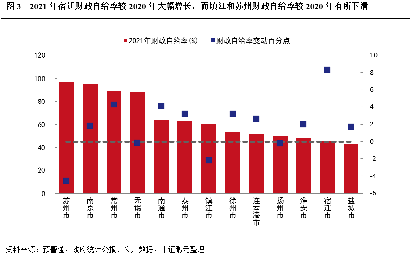 財(cái)政情況:2021年宿遷財(cái)政自給率大幅提高,95個(gè)區(qū)縣中有33個(gè)區(qū)縣財(cái)政自給率表現(xiàn)弱于去年。2021年江蘇省各地級(jí)市一般公共預(yù)算收入和政府性基金收入均較2020年有所提高,2021年宿遷財(cái)政自給率表現(xiàn)亮眼,較2020年提高8.28個(gè)百分點(diǎn)至45.80%,蘇州、南京、常州和無(wú)錫經(jīng)濟(jì)實(shí)力依舊較強(qiáng)、財(cái)政自給率依舊較高。區(qū)縣層面,2021年江蘇省絕大部分區(qū)縣一般公共預(yù)算收入和政府性基金收入均有所增長(zhǎng),昆山、江陰和江寧區(qū)一般公共預(yù)算收入仍穩(wěn)居頭部,但2021年邗江區(qū)一般公共預(yù)算收入下滑5.70億元至54.41億元,吳江區(qū)政府性基金收入下滑64.39億元至171.04億元,相城區(qū)、京口區(qū)、天寧區(qū)、吳江區(qū)和鐘樓區(qū)財(cái)政自給率較去年同期下降20個(gè)百分點(diǎn)以上。