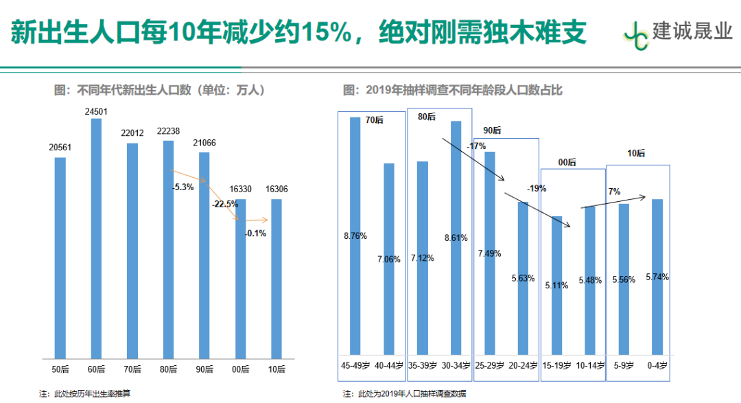 2000年以后,出生率明顯下滑,結婚年齡延后,新婚生育意愿低,這一趨勢將加劇房地產銷售規模增速的放緩。