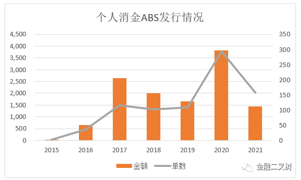 消費金融市場在16年、17年得到快速發展,但是17年12月出臺了《關于規范整頓“現金貸”業務的通知》,去杠桿已成為大趨勢,之后兩年ABS發行的量有所下降。20年年初受疫情影響,消費疲軟,但后續隨著一系列促進消費的舉措,居民消費逐漸恢復,尤其是線上消費,使得20年消金ABS發行總量上升。但20年下半年小貸新規的出臺,進一步規范了杠桿率及聯合放貸問題,加上螞蟻花唄、借唄的發行終止,以及對醫美貸入池的限制,對消金ABS的發行起到了一定的遏制,加上2021年5月25日上交所公司債券項目信息平臺顯示,螞蟻集團旗下兩家公司的資產支持專項計劃被終止。螞蟻花唄和借唄一直是個人消金ABS的大頭,而專項計劃的終止也直接影響了21年的發行總量,加上21年6月對馬上金融的監管,在一定程度上影響了個人消金ABS的發展,也導致了21年的總發行量和發行只數的大幅度減少。