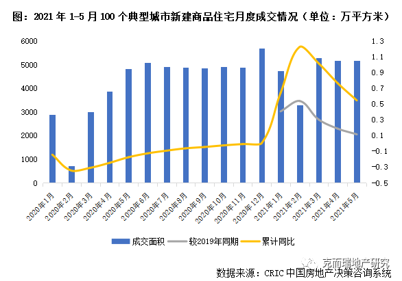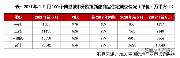 CRIC數(shù)據(jù)統(tǒng)計(jì)顯示,全國100個典型城市2021年1-5月商品住宅成交面積合計(jì)23642萬平方米,同比增長過半,較之2019年同期增長27%。