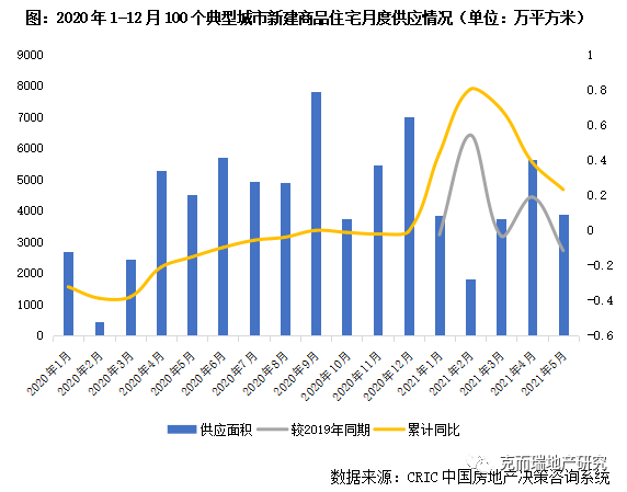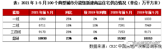 據(jù)CRIC統(tǒng)計(jì),2021年1-5月全國100個重點(diǎn)城市商品住宅新增供應(yīng)面積18930萬平方米,同比增長23%,相較2019年同期增長4%。