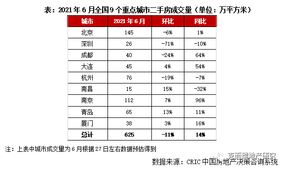 二季度末,各省市成交規(guī)模持續(xù)走低,經(jīng)歷“小陽春”市場顯著放量,年中市場逐漸恢復(fù)理性,月成交規(guī)模穩(wěn)步“三連降”。整體來看,6月全國9個重點(diǎn)城市二手房成交體量為625萬平方米,環(huán)比回落11%,同比仍有14%增幅。