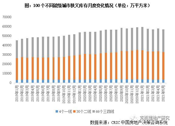 2021年開年以來,狹義庫存除2月顯著跳減之外,一直延續(xù)高位震蕩態(tài)勢。據(jù)CRIC監(jiān)測數(shù)據(jù),2021年5月百城商品住宅庫存量達(dá)到了56926萬平方米,環(huán)比微降1%,同比增長2%。“金三銀四”銷售旺季已過,5月房企推盤積極性略有回落,環(huán)比4月下降三成;成交熱度延續(xù),整體成交量與“銀四”基本持平:一線、三四線城市同環(huán)比齊降,需求釋放后略有回落;二線城市市場熱度穩(wěn)步回升,同環(huán)比齊增,顯著好于去年同期。總體來看,成交量略高于供應(yīng)量,狹義庫存小幅微降。