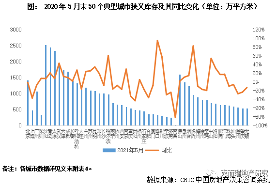 縱觀2021年上半年百城消化周期變動趨勢,1-4月基本在12個月左右持穩(wěn),5月得益于狹義庫存微降,成交熱度延續(xù),與上月基本持平,去化周期穩(wěn)中有降,由2021年4月末的12.34個月微降至10.79個月,顯著低于2020年同期水平。