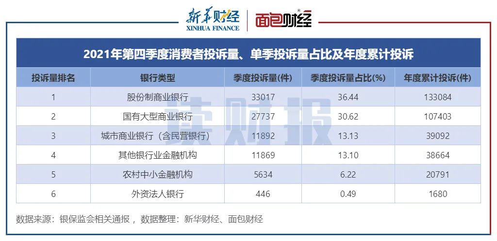 新華財經和面包財經根據銀保監會歷年發布的通報數據,對相關情況撰寫了一系列研究報告,本篇為綜述篇。后續將按照業務類型梳理各家銀行理財類業務、信用卡業務和個人貸款業務的投訴排名情況。