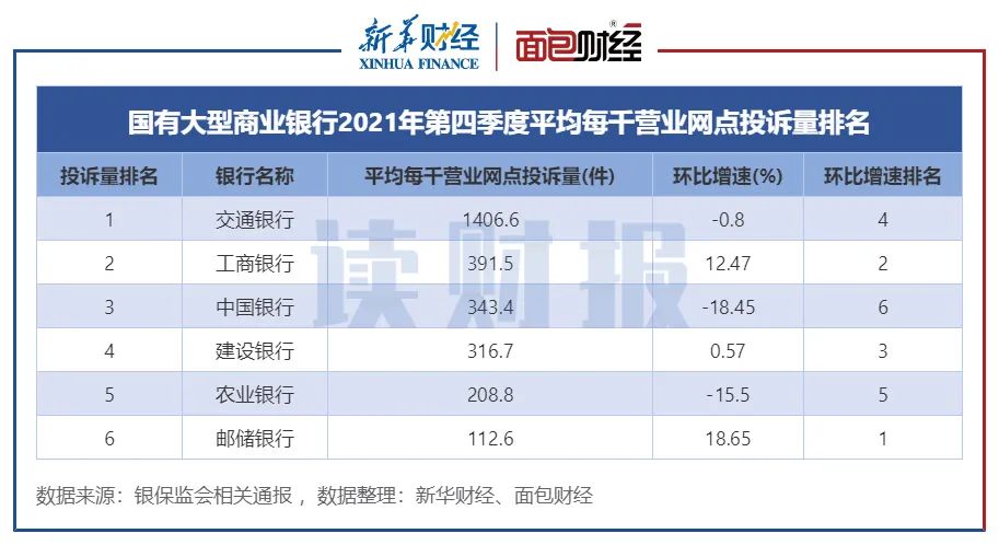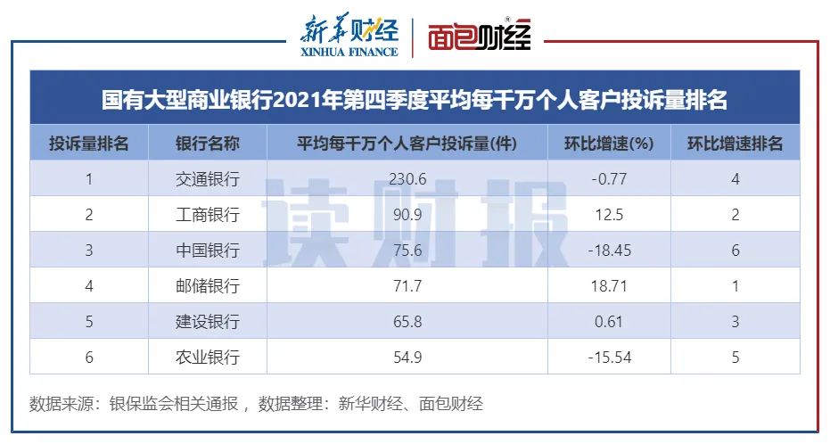 交通銀行2021年第四季度兩項指標均位列國有銀行首位且明顯高于其他國有銀行,顯示出該銀行的相關業務服務質量和消費者權益保護水平亟待提升。