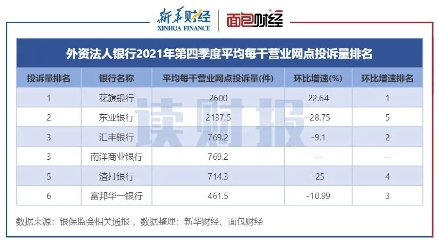 外資法人銀行中,2021年第四季度東亞銀行消費者投訴總量位居榜首,花旗銀行投訴增速最快。