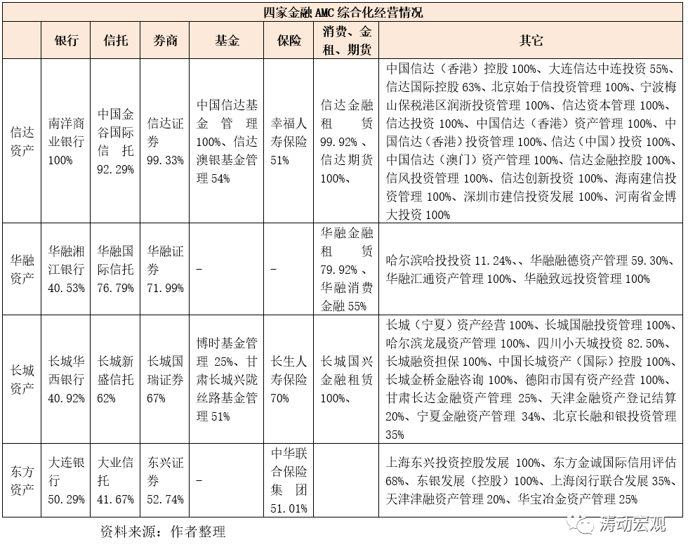 (2)1999年成立的四家金融AMC也已全部轉型為擁有各銀行、信托、券商、基金、保險、消費金融、金融租賃、期貨、資產管理、信用評級等各類金融牌照的金融控股集團,并廣泛涉足私募基金、房地產等業務。例如,信達資產擁有南洋商業銀行、金谷國際信托、信達證券、幸福人壽保險和信達基金;華融資產擁有華融湘江銀行、華融國際信托、華融證券、華融消費金融和華融金融租賃,長城資產擁有長城華西銀行、長城新盛信托、長城國瑞證券、長生人壽保險,東方資產則擁有大連銀行、大業信托、東興證券、東方金誠和中華聯合保險集團等。