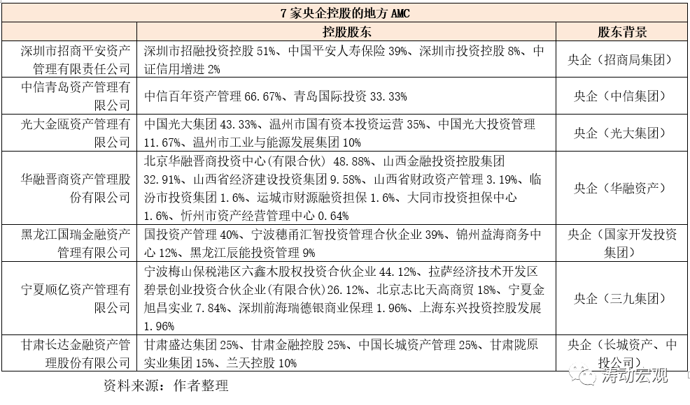 1、央企控股的地方AMC有7家,分別為招商平安資產管理(招商局集團)、中信青島資產管理(中信集團)、光大金甌資產管理(光大集團)、華融晉商資產管理(華融資產)、黑龍江國瑞金融資產管理(國家開發投資集團)、寧夏順億資產管理(三九集團)、甘肅長達金融資產管理(長城資產)。