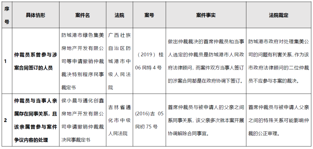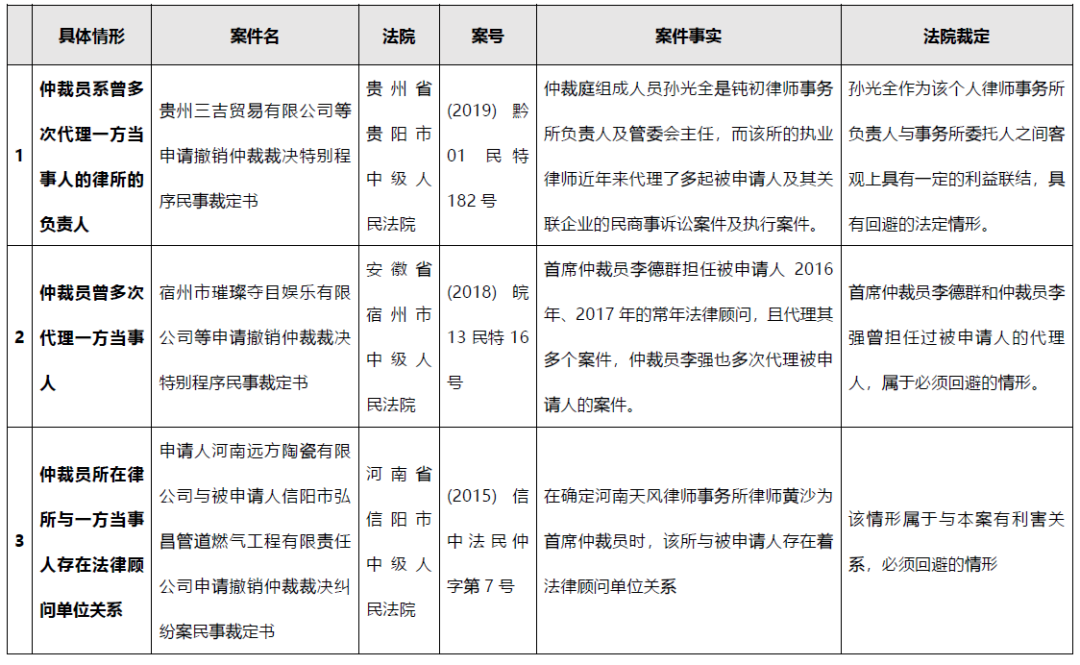我國(guó)《仲裁法》第13條對(duì)仲裁員“公道正派”要求可以理解為是對(duì)仲裁員公正性的強(qiáng)調(diào)。而對(duì)不符合公正性要求的情況,《仲裁法》在第34條列舉了一些仲裁員“必須回避”的情形,而通過(guò)對(duì)我國(guó)過(guò)往法院判例的檢索,可簡(jiǎn)要將必須回避情形的具體場(chǎng)景總結(jié)為以下三種,具體如下: