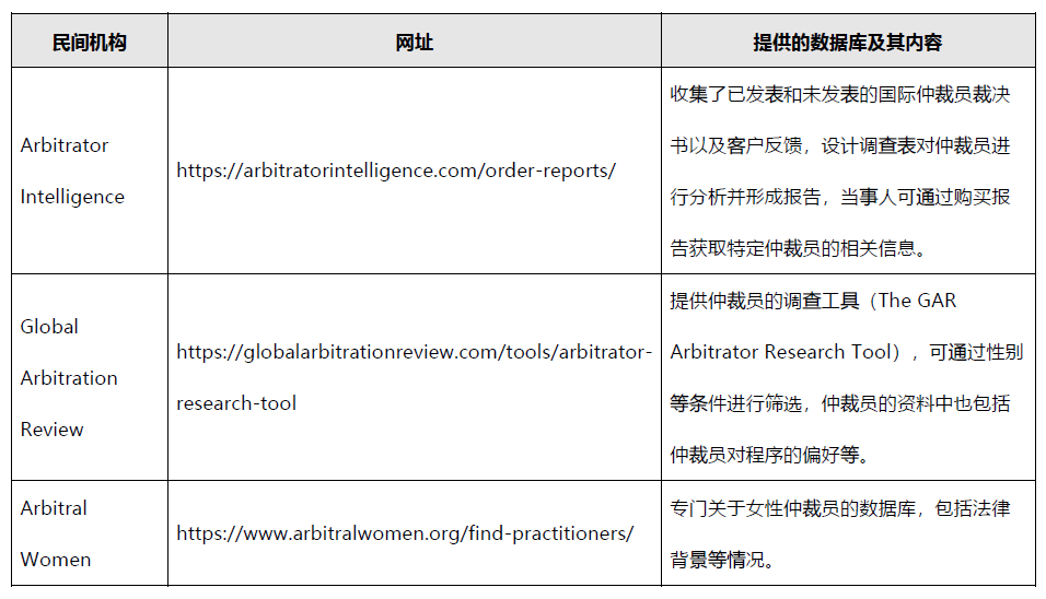 許多仲裁機(jī)構(gòu)、仲裁協(xié)會(huì)和民間機(jī)構(gòu)會(huì)制作仲裁員數(shù)據(jù)庫(kù)方便當(dāng)事人選擇仲裁員。同時(shí),在一些特殊的仲裁領(lǐng)域也會(huì)有專門的數(shù)據(jù)庫(kù)供查詢。[7]