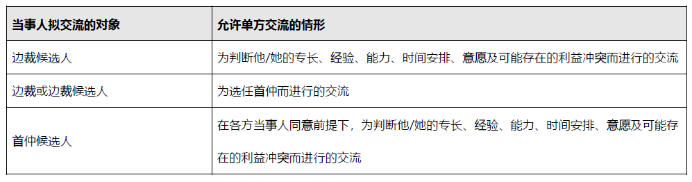 而對(duì)于單方交流的內(nèi)容,《當(dāng)事人代理指引》中指出應(yīng)僅限于提供爭(zhēng)議的概括性描述以及獲取有關(guān)潛在仲裁員是否合適的信息。一般可交流的話題有: