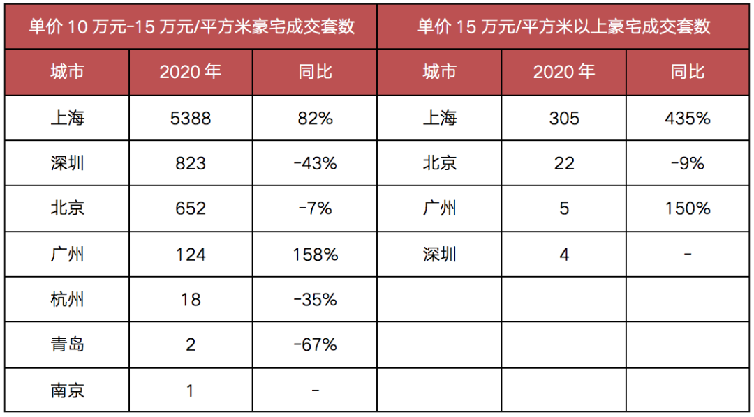 從總價來看,5000萬元以上豪宅,上海2020年共成交256套,高于排名第二的北京100多套,總價3000-5000萬元豪宅成交上海約為其他所有成交的2倍,其他總價1000-3000萬的豪宅成交來看,上海也在全國保持遙遙領(lǐng)先。