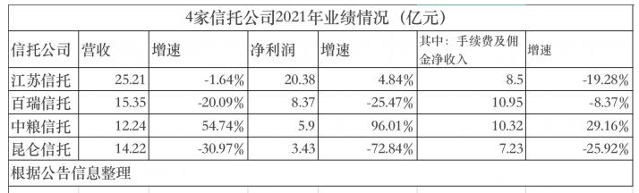 作為頭部信托公司,江蘇的數(shù)據(jù)大概是沒有什么問題的。也是這4家信托公司中綜合實力最強的,處于行業(yè)中上游。數(shù)據(jù)顯示,2021年江蘇凈利潤20.38億元,同比增長4.84%;2021年營收25.21億元,同比下降1.64%;手續(xù)費及傭金凈收入為8.5億元,同比下滑19.28%,雙雙下降。