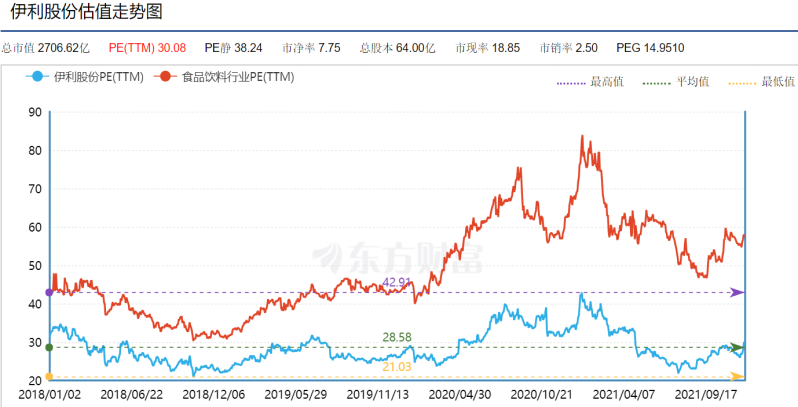 相對于整個食品飲料板塊,伊利估值還在底部徘徊。截至12月10日,伊利動態PE為30.08倍,剛剛超過近年來估值均值的28.58倍,而食品飲料板塊則達57.44倍,高低對比立下可見。
