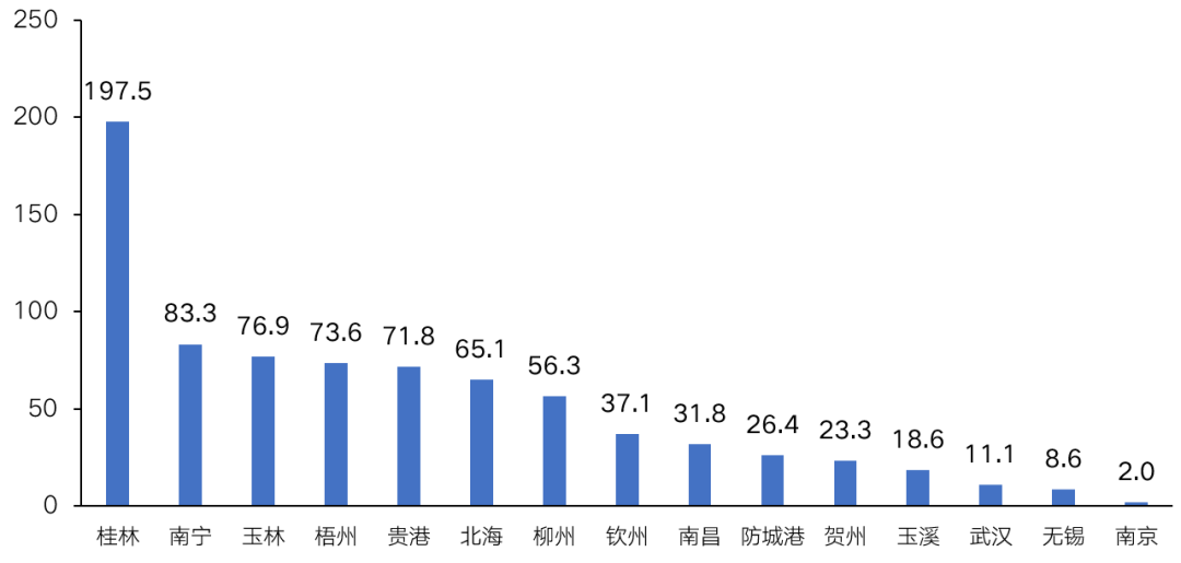 據(jù)公告披露信息顯示,此次收購涉及目標(biāo)項(xiàng)目共57個,包含54個開發(fā)項(xiàng)目及3個代建項(xiàng)目,總計(jì)容未售建筑面積為825.17萬平方米。其中,54個開發(fā)項(xiàng)目計(jì)容共計(jì)未售建筑面積783.33萬平方米,90.8%位于廣西各城市核心區(qū)域,主要分布在桂林、南寧、玉林等城市,且以住宅為主,流動性強(qiáng)。
