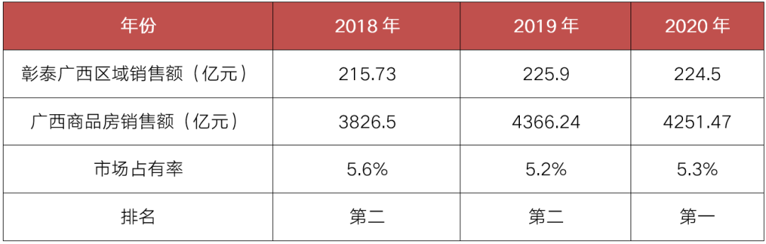 彰泰作為廣西規(guī)模最大的本土房企,2018-2020年連續(xù)三年銷售額均超過200億元,其中2020年在廣西區(qū)域全口徑銷售額達(dá)224.5億元,權(quán)益銷售金額達(dá)161.4億元,均位列第一。根據(jù)廣西2020年商品房銷售額4251.5億元計(jì)算,市場占有率約為5%,超過碧桂園位居首位。今年一季度,彰泰繼續(xù)以47.44億元領(lǐng)跑,增長預(yù)期向好。