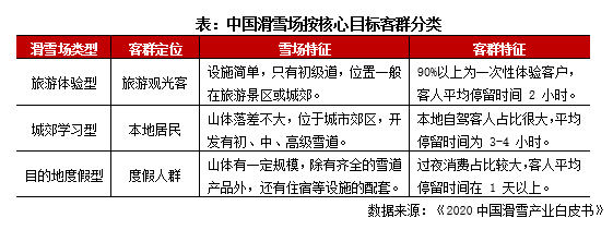 冰雪場地主要涵蓋滑冰場與滑雪場等形態,由于當前新增滑冰場多為商業綜合體形式,基本交由冰場品牌方進行承租運營(少數由商業體自建并自主運營,如華潤旗下的冰紛萬象系列),所以暫不在本文的參照范圍內。國內滑雪場按核心目標客群可分為三類:旅游體驗型、城郊學習型及目的地度假型,據《2020中國滑雪產業白皮書》數據顯示三類雪場占比75%、22%及3%,新建雪場中目的地滑雪度假區呈上升趨勢,而旅游體驗型滑雪場則出現下滑趨勢。