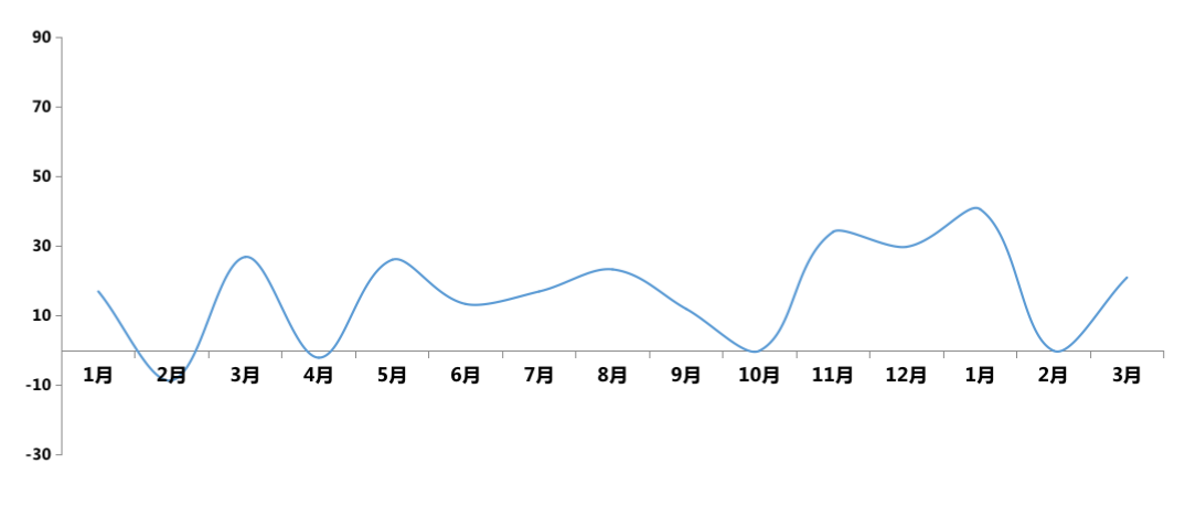 圖:2020年1月-2021年3月外資凈投資額變化趨勢