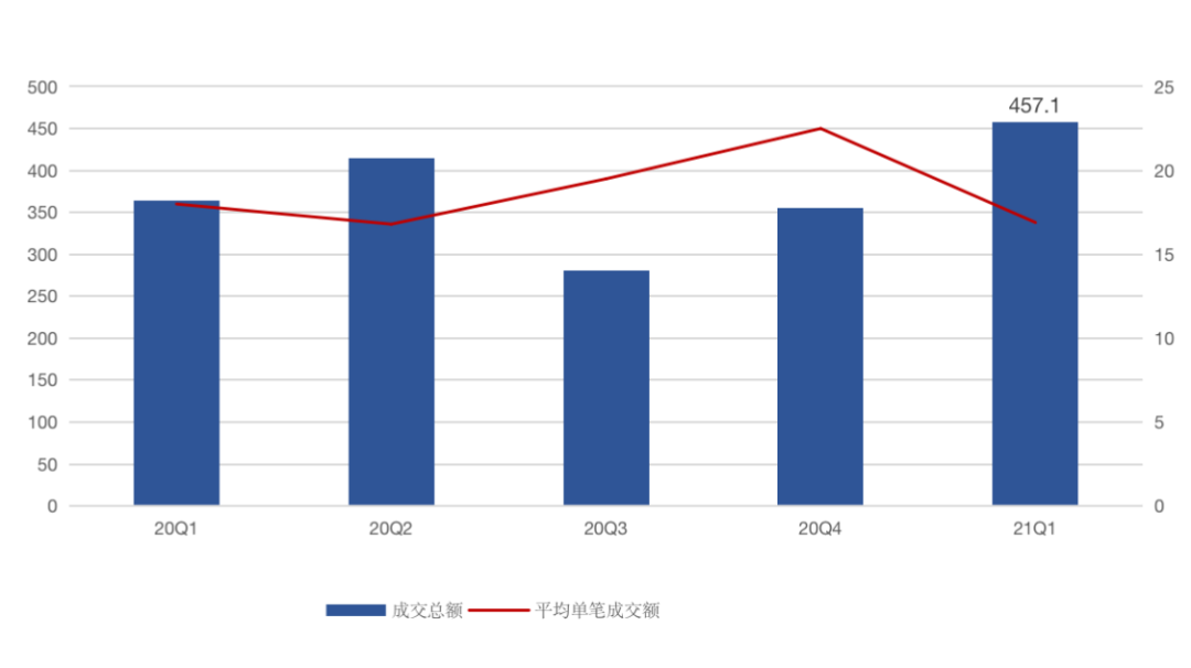 受益于辦公資產在大宗市場的活躍表現,2021年一季度大陸地區單筆成交額超1億元人民幣的商業地產共成交27筆,交易總額達到457億元,同比上漲25.7%,環比上漲28.6%。延續了前兩個季度的增長態勢。