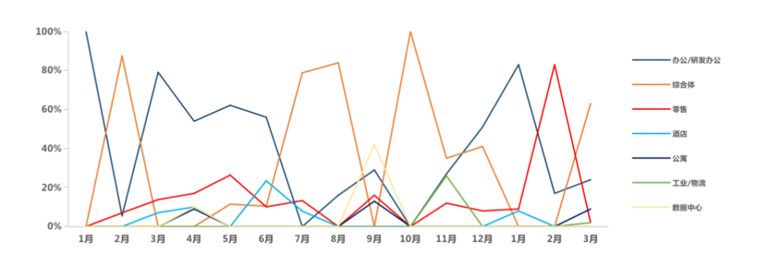 重點城市中北京大宗成交在3月迅速升溫,環比增長67.9%,綜合體成為貢獻第一的業態。