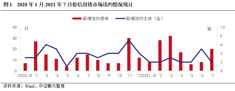 7月首次違約債券20只,違約數量出現明顯增長,主要是因為藍光發展的風險顯露,存續債券陸續違約,7月首次違約債券涉及6家發行人。從違約類型看,本月新增違約債券除藍光發展的4只債券為交叉違約,其余均為實質性違約。從違約事件看,6只為本金利息項違約,1只涉及回售款項違約,3只因破產觸發其到期,4只為交叉違約,6只為加速清償。從債券類型看,公司債9只,中期票據5只,定向工具3只,私募債2只,短期融資券1只。從企業性質看,2家新增違約主體均為民營企業。從上市情況看,本月新增違約主體均為上市公司。從處置方式看,3只債券發行人與持有人達成展期兌付協議,其他債券均未公布兌付方案。