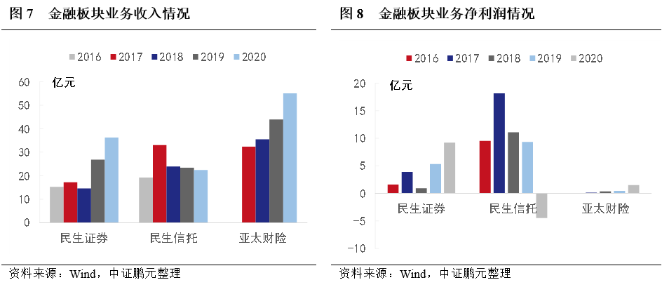 第二,金融板塊收入不確定性較高。金融板塊收入主要來自民生證券、亞太財險和民生信托,受政策和市場環境影響較大,金融板塊收入增長相對緩慢,存在一定波動性和不確定性。其中,信托業務2018年后收入呈現微幅下降,受風險事件影響大額計提減值損失,2020年凈利潤轉負,而保險業務收入呈現增長,但利潤率較低。