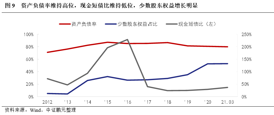 地產和金融不分家的邏輯,在泛海系中延伸。隨著收購的推進,泛海系打造了民生系金融家族,并在其中占有主導地位。轉型完成了第一階段的業務布局,進入第二階段的現金流綜合管理,逐步出現轉型中的“陣痛”。第一,地產板塊停止擴張,但存續項目后續投資規模較大。公司地產板塊土地資產主要為2016年之前獲得,此后以釋放存量土地價值為主。隨著地產項目建設投資的推進,存貨規模大幅增長,在資產中占比逐年增加,截至2018年3月,存貨占比63%,在建項目計劃總投資821.78億元,尚需投資343.94億元,再融資壓力較大。第二,布局金融業務,帶來金融資產增長。通過收購(增資)亞太財險、民生期貨、民生證券和民生信托等板塊布局民生系,可供出售金融資產2015年、2016年出現大幅增長,交易性金融資產隨金融板塊業務的發展而增長,但業務受制于資管新規影響,金融業務板塊收入在2018年出現放緩,隨著2019年進一步布局金融業以及市場回暖,金融相關資產占比大幅提升。其中,交易性金融資產主要為子公司民生證券自營業務投資的證券,變現能力整體較好。第三,負債大幅增長,短期債務占比逐步提升,再融資壓力提升。受存量地產業務和金融業務擴張需求影響,2012年后公司負債規模出現明顯增長,其中,2014-2016年受地產項目融資增長影響長期借款占比大幅提升,隨著債務逐步到期,2017年以來短期債務占比逐漸增加,同時,公司長期融資規模出現明顯下降,再融資壓力提升,面臨集中償付風險。