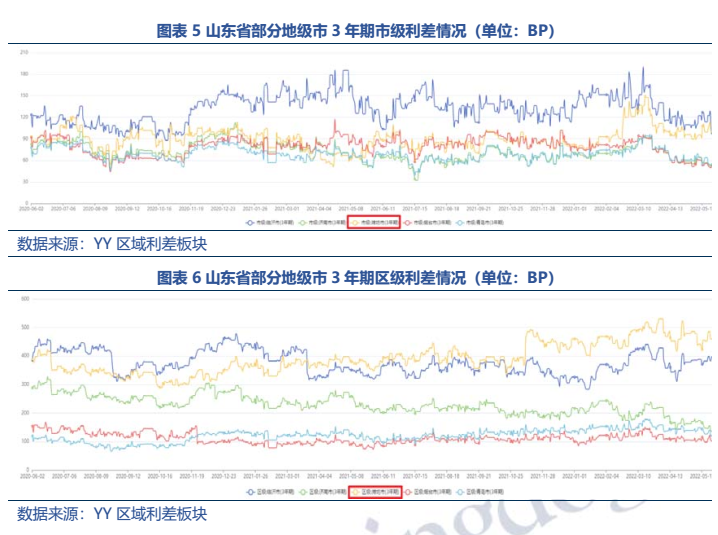 (3)從區(qū)域利差來看,濰坊區(qū)縣級(jí)平臺(tái)的市場認(rèn)可度較弱,2022年5月末區(qū)級(jí)3年期利差高達(dá)469BP。