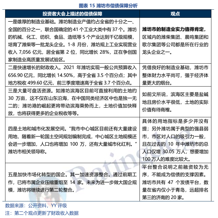 懇談會(huì)和信保基金并不能直接改變市場看法(如蘭州),具體還是要回歸到區(qū)域的支撐來看,投資者會(huì)上的對(duì)濱海經(jīng)開區(qū)土地的贊揚(yáng)和中心城區(qū)城市化紅利的期盼暫且不論,但濰坊當(dāng)?shù)刂圃鞓I(yè)水平依然值得肯定,整體財(cái)力水平尚可(省內(nèi)第三),但是在非標(biāo)壓降、平臺(tái)整合和管控及資金運(yùn)用效率上還需加強(qiáng)。