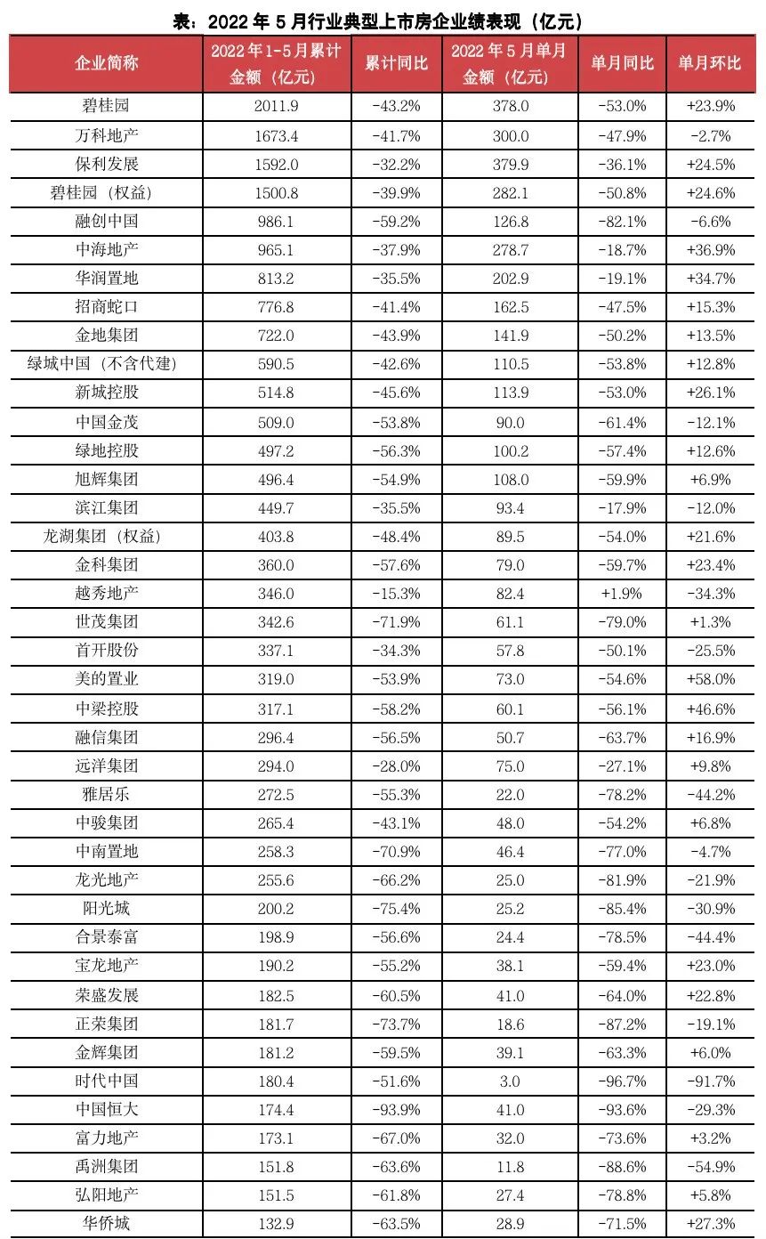 1、2022年5月,行業(yè)下行壓力持續(xù)、疊加部分城市疫情反復,市場信心不足、企業(yè)表現(xiàn)仍相對低迷。TOP100房企單月實現(xiàn)銷售操盤金額4546.7億元,較上年同期降低59.4%。但得益于各地樓市紓困政策,加之“五一”假期房企推盤及營銷積極性提升,環(huán)比增長5.6%。累計業(yè)績來看,百強房企1-5月的整體操盤業(yè)績規(guī)模同比降低52.3%,降幅較上月進一步擴大。