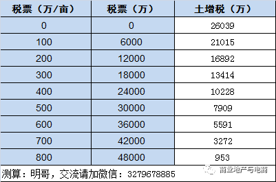測算結(jié)果是應(yīng)繳土增稅7909萬。接下來我們在不同的稅票金額假設(shè)下,測算土增稅和凈利率是如何隨著稅票變動的。