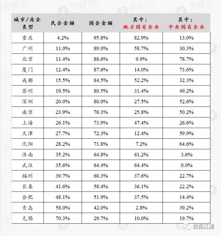 最近一段時間,很多城市都完成了第二批次的集中土地出讓,土拍的結果也都紛紛出爐了。有一組數據,關于部分城市國企和民企拿地比例的統計,非常有意思。