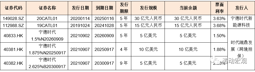(2)截至2021年9月底,寧德時代共有5只存量債券,債券余額為175.28億元(凈增31.46億元)。具體看,這5只債券主要包括兩只境內債(合計45億元人民幣)和3只美元債(合計20億美元),其中美元債主要由寧德時代借助在香港的全資子公司時代瑞鼎發展以跨境擔保的形式發行。