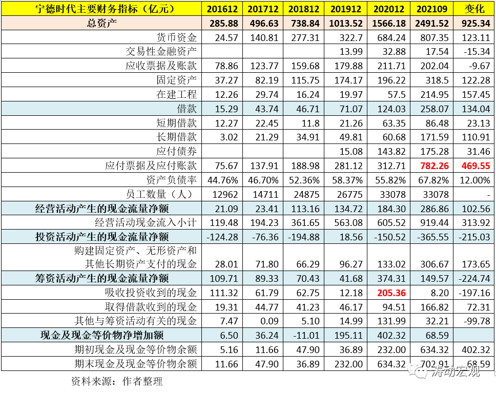 (1)寧德時代有很大一塊債務體現在無息債務上,即以應付票據及應付賬款為代表的營運資金,今年9月底應付票據及應付賬款余額達到782.26億元,較2020年底大幅增加469.55億元,增幅較大,可以被視為值得關注的異常項,表明寧德時代的營運資金需求較高。