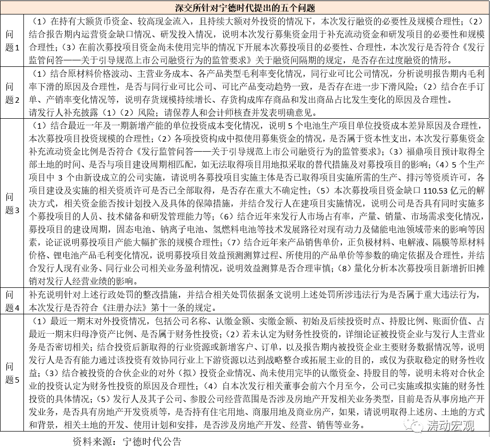 2、整體上看,深交所提出了五個問題,并要求保薦人、會計師、律所等中介機構出具審核意見,其根本問題是質疑寧德時代可能存在過度融資,即在持有大額貨幣資金、較高現金流入,且持續大額對外投資的情況下,此次定增的必要性及規模合理性需要進行說明等。