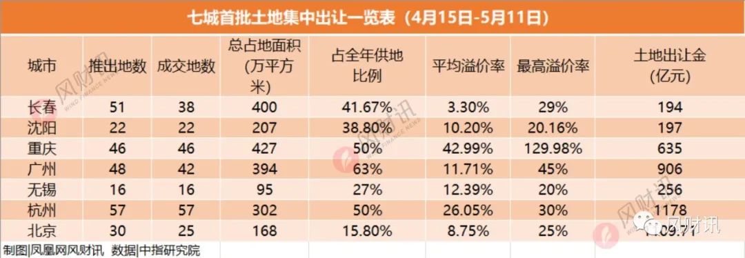 4月15日-5月11日,長(zhǎng)春、沈陽、重慶、廣州、無錫、杭州、北京完成了首批土地集中入市的拍賣。