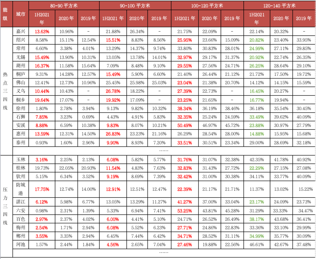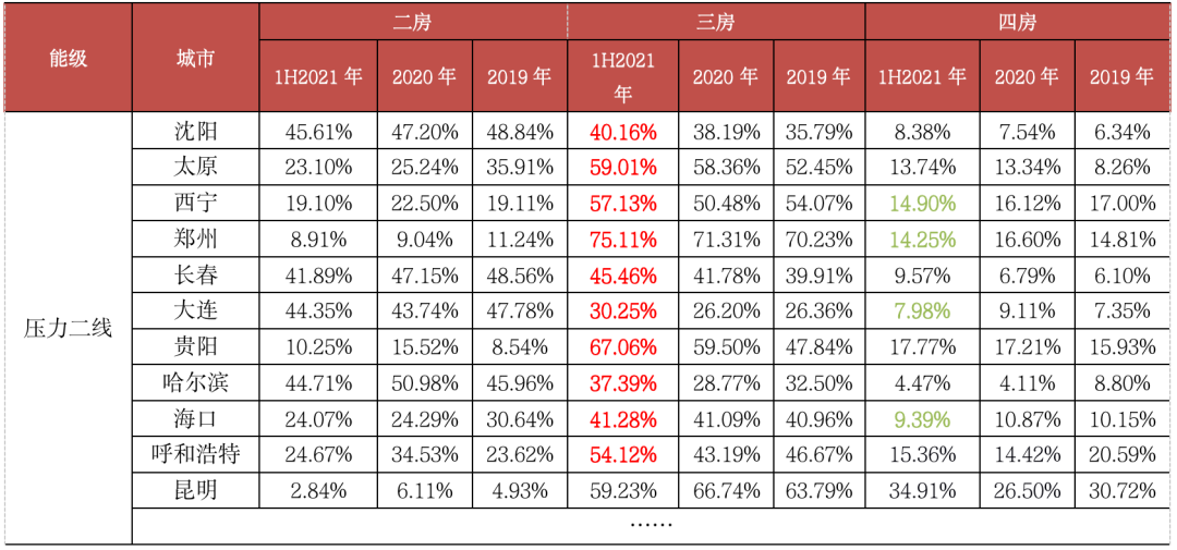2021年上半年,三四線城市三房仍是成交主力,但成交占比階段性下行,較2020年減少0.47個PTS至55.75%。二房成交占比升至14.10%,較2020年增長1.62個PTS,較2019年亦增長0.69個PTS。直觀反映三四線城市購房消費適度降級,經濟增長放緩、就業壓力加大、居民減收等多方面因素共同導致市場購買力疲軟。壓力二線城市購房消費降階,部分改善需求由四房降級為功能性三房。