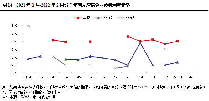 2022年2月,企業債券期限分布于7年期等期限品種。其中,7年期品種發行14只,占比67%,發行規模100.50億元,占比74%;5年期品種發行3只,占比14.3%,發行規模10.70億元,占比7.8%。與上月相比,5年期和7年期品種發行規模占比較上月分別下降3和上升9個百分點。綜合2022年1-2月看,7年期品種發行數量和規模分別為50只,303.80億元,占比分別為74%和67%。與上年同期相比,7年期品種規模占比上升10個百分點。