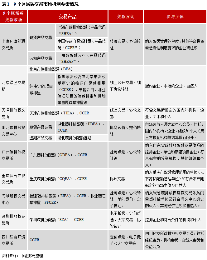 2011年10月,發(fā)改委發(fā)布《關(guān)于開展碳排放權(quán)交易試點(diǎn)工作的通知》(發(fā)改辦氣候[2011]2601號),同意在北京、天津、上海、重慶、湖北、廣東及深圳開展碳排放權(quán)交易試點(diǎn)。經(jīng)過近2年的籌備,2013年初,除重慶和湖北外的5個試點(diǎn)地區(qū)碳排放交易場所通過發(fā)改委備案,2014年4月,重慶和湖北兩地碳排放交易場所也通過發(fā)改委備案。2013年6月至2014年6月期間,試點(diǎn)地區(qū)碳排放交易陸續(xù)開展,其中2013年6月18日,深圳試點(diǎn)率先啟動交易。2016年,在首批7個試點(diǎn)后,四川、福建也先后成為國家備案碳交易機(jī)構(gòu)的省份,當(dāng)年12月兩省碳排放交易場所先后啟動。至今,全國共有9個區(qū)域碳交易市場。碳交易市場是利用市場機(jī)制來控制和減少溫室氣體排放,推動綠色低碳發(fā)展。