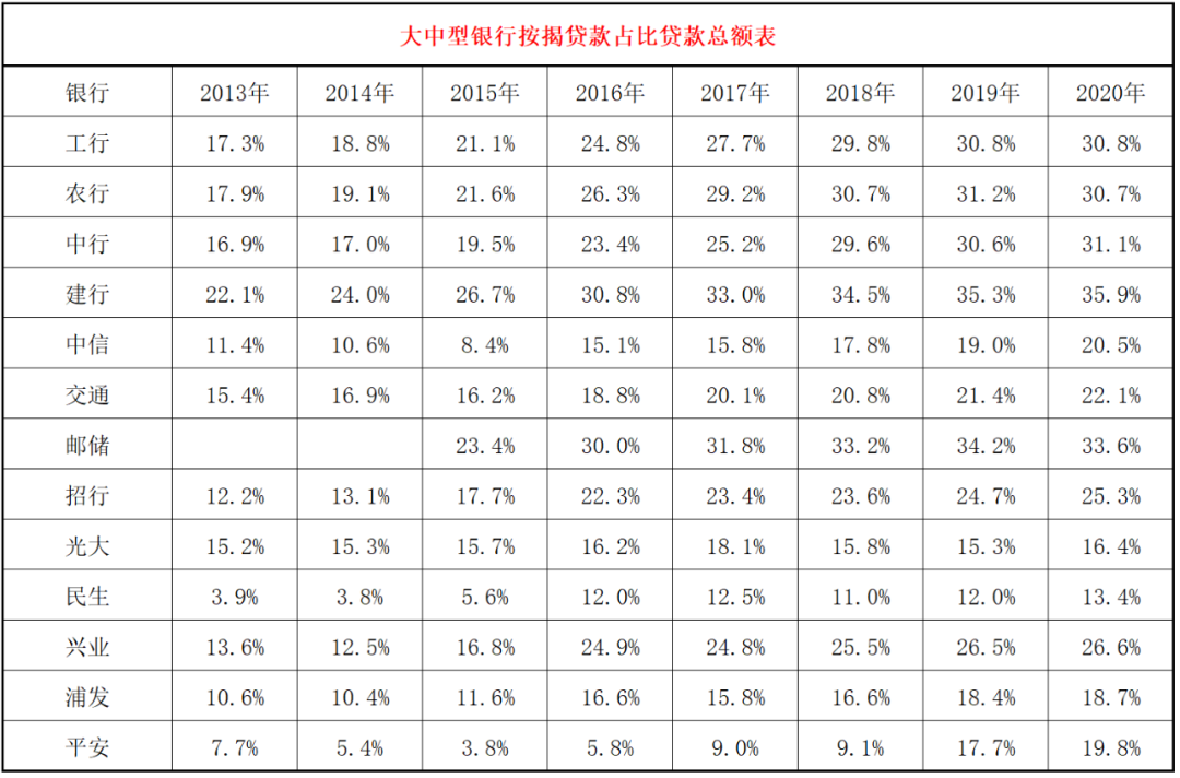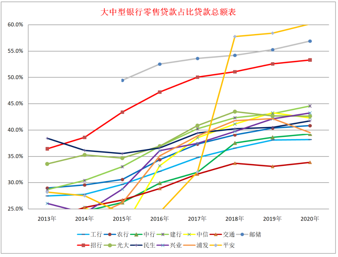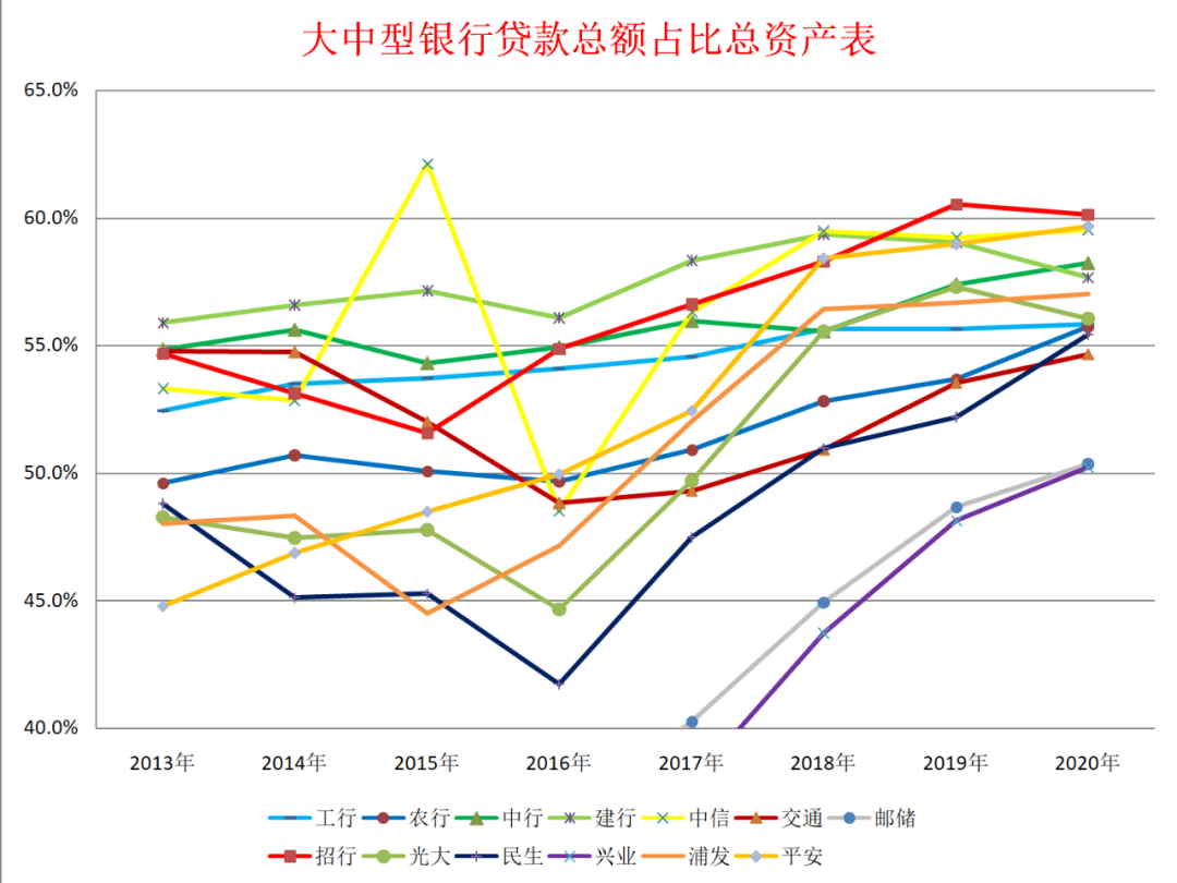 我們統計了13家大中型銀行過去八年貸款與總資產的占比、零售貸款與貸款總額的比值,制造業貸款與貸款總額的比值,批發零售業貸款與貸款總額的比值,按揭貸款與貸款總額的比值。