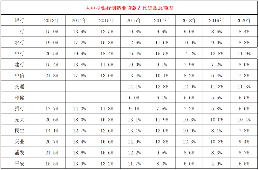 4、制造業貸款占比情況。中國的制造業是全球的王者,激烈的競爭也決定了很多企業生存非常艱難,集團企業平均壽命7年,中小企業平均壽命不到3年,能從銀行貸款的制造業企業按理并不差,但從歷年各家銀行的財報看,除掉核銷的不良,公布的不良率有不少接近10%甚至超過10%,憑這些年對數據的觀察,制造業貸款應該會有20%會是壞賬,也就是貸款出去1個億,應該有2000萬壞賬,幾個點的利息完全覆蓋不了不良,制造業高的企業需要多一份謹慎。制造業貸款從2013年占比18%壓縮到現在占比8%,這里面壓縮最堅決最快最早的是招商銀行,招商銀行2016年制造業貸款就壓縮到10%以下,其他銀行都在10%以上,那兩三年也是招商銀行不良集中爆發的時期,現在壓縮到只有5%。后來中信銀行也壓縮的非常猛,從21%壓縮到6%,結果行長被抓第一條理由就是壓縮制造業過猛。對于中國銀行,制造業一直占比比較高,但是中國銀行新生不良一直很低,在四大行也是最低的,多少還是有點存疑,工農建三家都是中規中矩慢慢的壓縮。