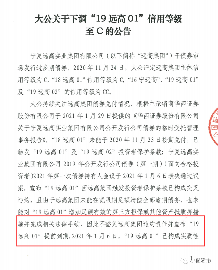 2月3日,大公公告稱,維持寧夏遠高實業集團有限公司(以下簡稱“遠高集團”)主體信用等級為C,將“19遠高01”信用等級調整為C,維持“16寧遠高”和“19遠高02”信用等級為CC。