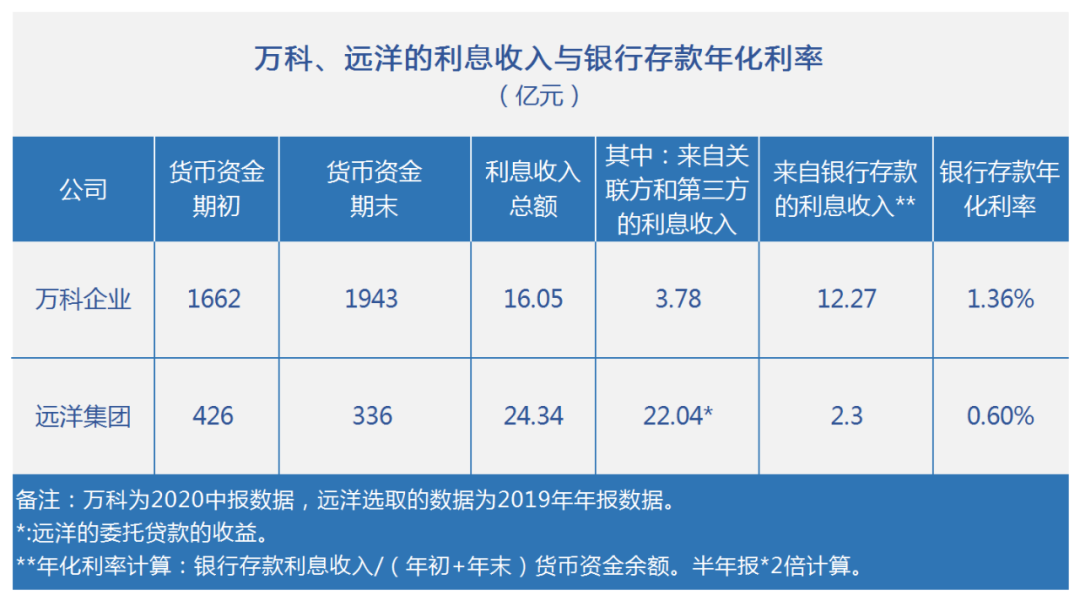 萬科披露的比較詳細的數據,以上述方法計算:萬科2019年度存款綜合利率也是1.36%。