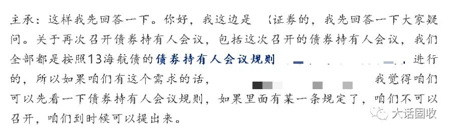 無(wú)獨(dú)有偶,昨晚海航的會(huì)議上,主承的發(fā)言也是強(qiáng)調(diào)“債券持有人會(huì)議完全是按照會(huì)議規(guī)則”來(lái)進(jìn)行的。有質(zhì)疑的話(huà),“先去看看這個(gè)會(huì)議規(guī)則”: