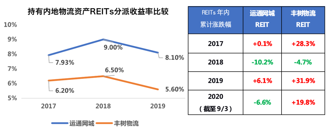 綜上可以發現,物流REITs的資產要求最高但其分派收益率也是最高的,達5.6%-8.1%,購物中心REITs次之,為5.3%-7.4%,最低的是商辦混合REITs,約3.5%-6.6%。