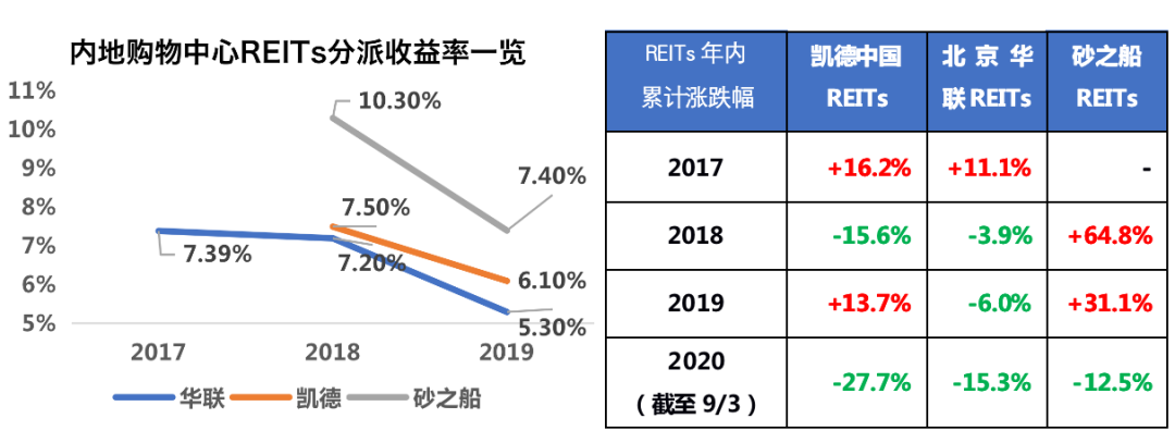 注2:REITs年內累計漲跌幅=(最后交易日收盤價-首個交易日收盤價)/首個交易日收盤價,砂之船18年為IPO價格